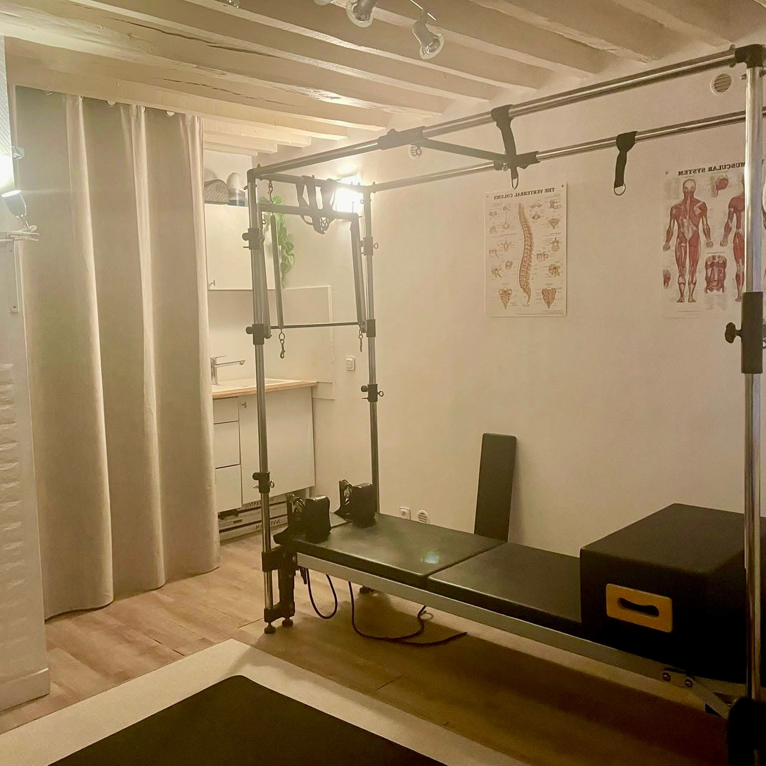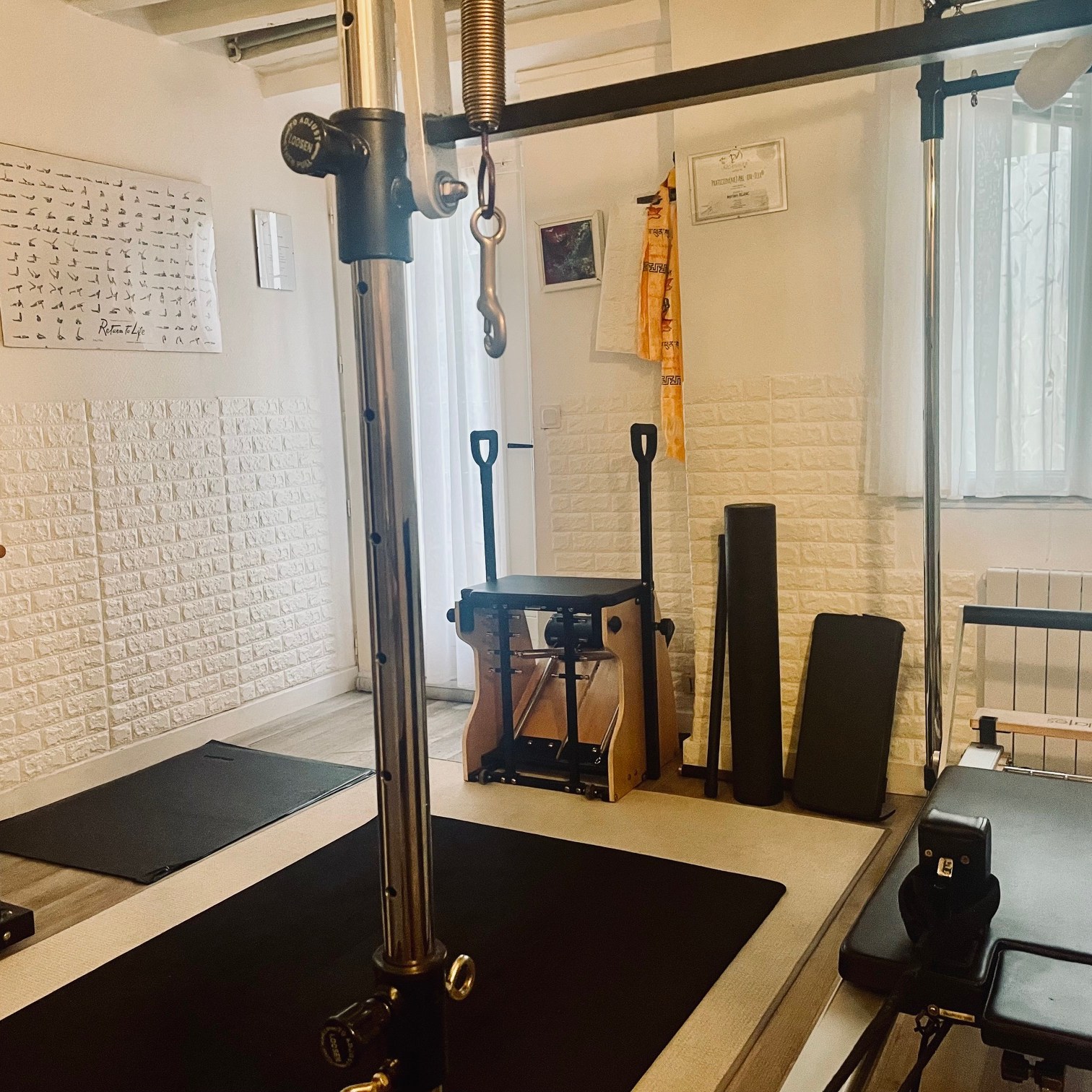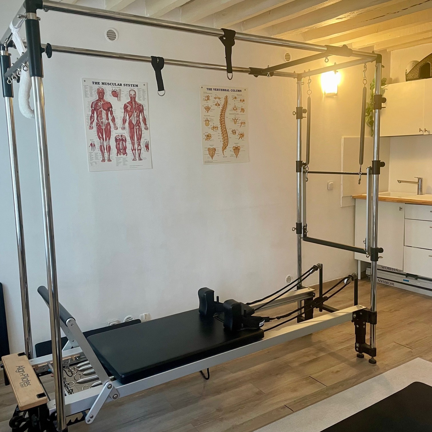 Il est équipé d’une cadillac combo, d’une combo chair, d’un ladder barrel, d’un spine corrector, d’un foot corrector et de petit matériel pour le Pilates au sol ( swiss ball, magic circle, foam roller, tapis). Il permet d’aborder la méthode Pilates dans toute sa richesse et sa diversité et permet surtout d’adapter les différents mouvements aux besoins et objectifs de chacun.